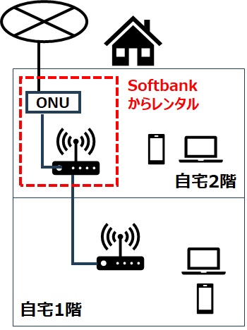 - 2階: ソフトバンクから提供されたONU(光回線終端装置)+ルータ