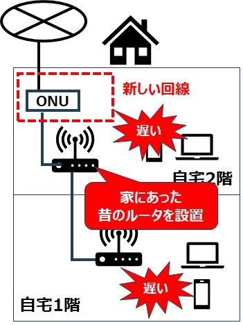 古いルータの処理能力が低く、インターネットのデータがスムーズに流れず、1階のネットワーク全体に影響を与えていました。