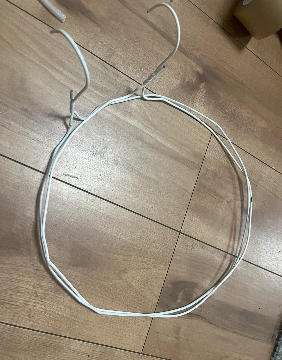 ▪️針金ハンガー2本を、それぞれ丸くなるように曲げます。