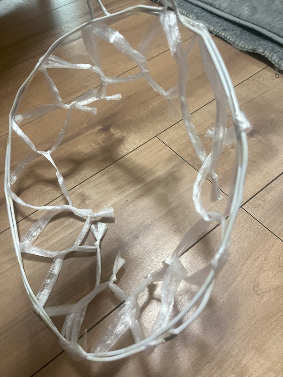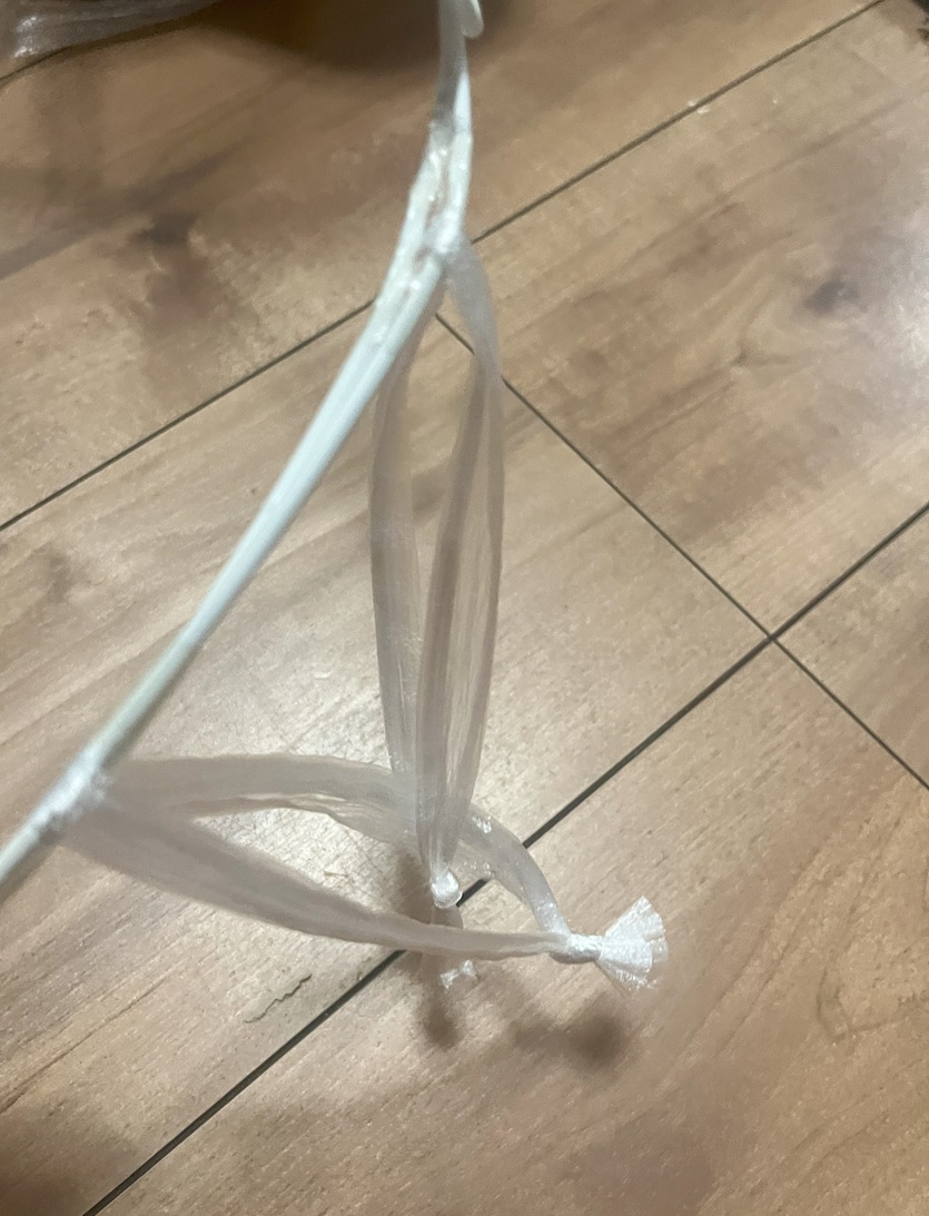 ▪️1本ずつ、2本のハンガーの間に通して、リングに等間隔で結びつけます。
