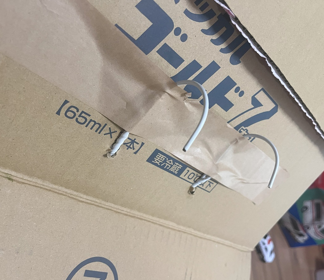 ダンボールの上端に穴を2か所あけ、ビニール紐を通して結びます。