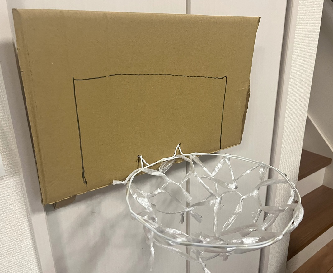あとはバックボードのダンボールにマジックとかで線を足すとよりバスケットゴールの雰囲気が出ます。